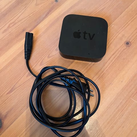 Apple TV 3. gen med medfølgende aluminiumsfjernkontroll og strømkabel. Enheten kobles til TV via HDMI kabel som ikke følger med. Egnet for strømming av innhold og avspilling av media på TV. Eldre modell. Noen apper og funksjoner er utdaterte og virker ikke lenger, blant annet NRK og TV 2.