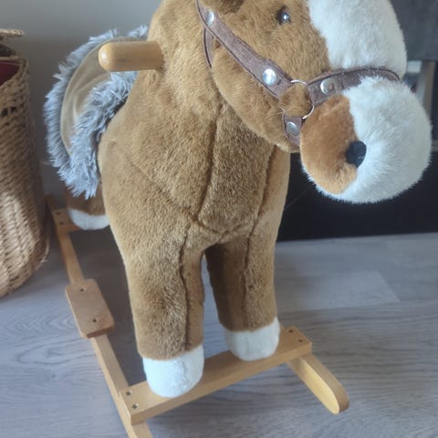 Herlig gyngehest med hestevrinskelyd om man trykker den på øret. Stødig og grei for små barn. Hentes i langevåg