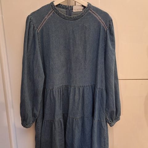 Noella festkjole i størrelse L for dame. Kjolen er laget i polyester og har en lilla, glansfull overflate med strukturert mønster. Modellen har korte puff-ermer, v-utringning og belte i livet som gir definert midje. Lengden er kort, egnet til fest og andre anledninger der en pen kjole ønskes. Materiale: 100 % polyester. Farge: lilla.