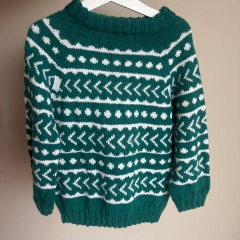 Mikkel Mini hjemmestrikket ullgenser, strikket i drops karisma🌿🍁passer ca 2-3 år. Ny, ubrukt og vasket i parfymefri ullvask.
