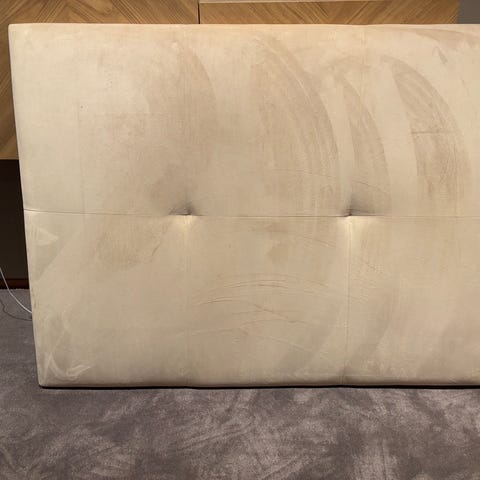 Ingen grunn til å bekymre seg for merker på veggen, siden baksiden av sengegavlen har en liten støtfanger laget av jute for å forhindre riper.