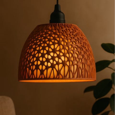 Den myke, vridde strukturen til lampeskjermen sikrer jevn lysfordeling og skaper en behagelig, moderne atmosfære. Lampen består av to separate deler: lampeskjermen og lampefoten er trykt uavhengig av hverandre.