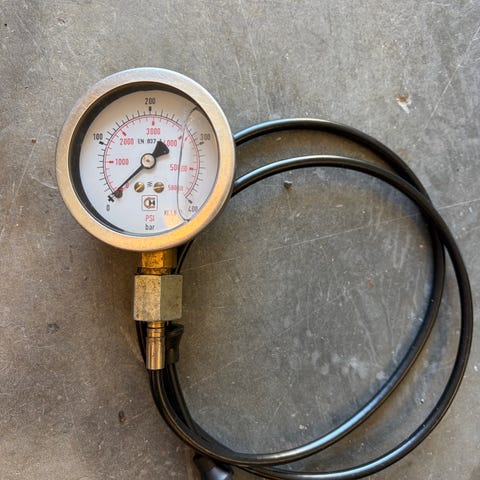 Manometer trykkmåler for avlesning av trykk. Rund analog skive med skala i bar og rød markering for høyere trykkområder. Utstyrt med tilkobling nederst med gjenget feste og rød beskyttelseskappe. Egnet til bruk der det er behov for å kontrollere og overvåke trykk i et lukket system, for eksempel i tekniske installasjoner eller verkstedbruk.