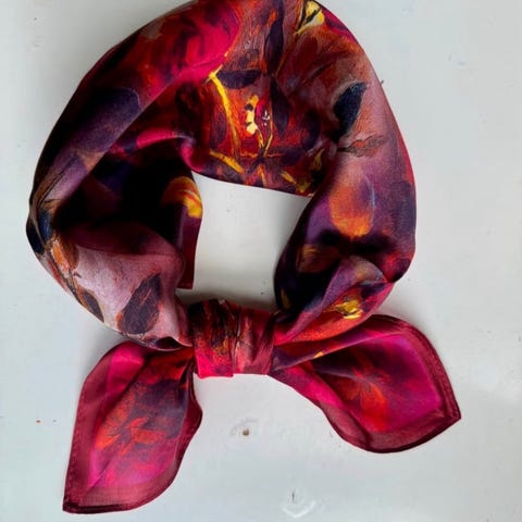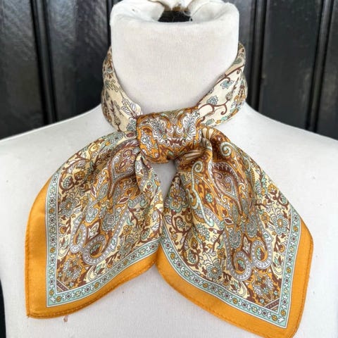 100%silke. Ekstra fint til bunad og jeans. Kan brukes av menn også. Mykt og behagelig skjerf. Skjerfet er i Mulberry silke som er fineste silke kvalitet. Helt som nytt. Veldig enkelt å dandere på ulike måter. Størrelse 53x53cm. Kan gjerne sende som brev med posten til 46.-