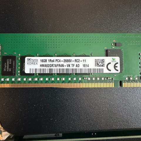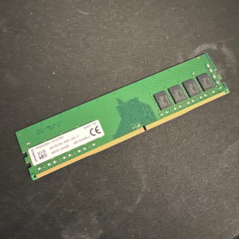 RAM-minne DDR4 DIMM for stasjonær PC. Standard grønt kretskort med minnebrikker på én side. Passer hovedkort som støtter DDR4 DIMM-minne. Egnet som oppgradering eller erstatning av eksisterende minne i kompatible systemer. Kapasitet, hastighet og produsent er ikke spesifisert og bør kontrolleres mot merkelapp eller ved testing i PC før bruk.