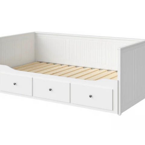 IKEA Hemnes dagseng med skuffer i hvit utførelse. Sengen har sengebunn med trelameller og to romslige skuffer under for oppbevaring av for eksempel sengetøy eller klær. Her to