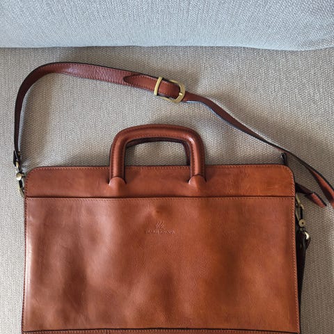 Lekker lærveske med plass til pc og skriveutstyr, perm og notater. Flere praktiske rom.