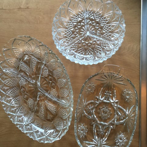 Rosa glassfat og 4 skåler dekorert mønster