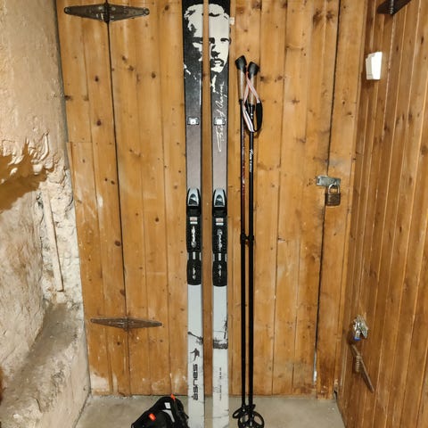 Fjellski med tilhørende skistaver og et par sko i størrelse 38 (US 7.5, UK 5).
