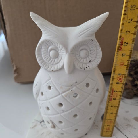Black Design ugle formet lysholder i keramikk i hvit farge med sølvfargede detaljer på hode og ører. Lysholderen har utskårne dråpeformede hull rundt kroppen som slipper ut lys. Åpning på baksiden gjør det mulig å plassere telys eller lite lys inni. Passer som dekorasjon i interiør og til stemningsbelysning.