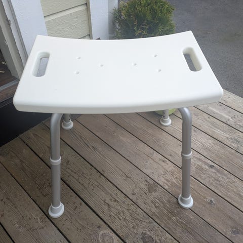 Setet har dreneringshull for å lede bort vann. Benene kan høydejusteres ved hjelp av hull og låsepinne, og har gummiføtter for bedre stabilitet på vått underlag. Egnet som sittemøbel i dusj eller bad for personer som ønsker ekstra støtte under dusjing eller ved stell.