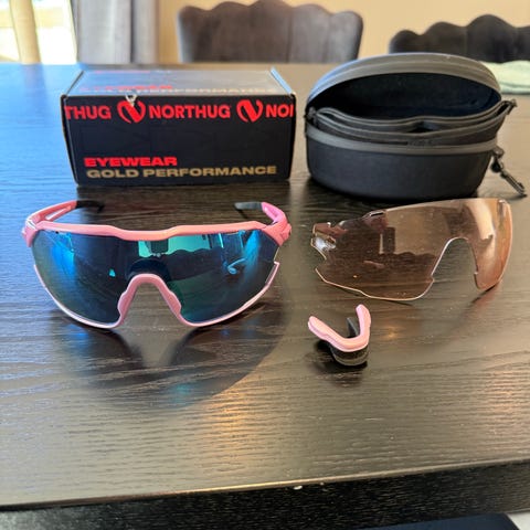 Northug sportsbriller unisex i rosa ramme med speilglass. Brillene har stor, sammenhengende linse som gir bredt synsfelt og god dekning rundt øynene. Leveres med etui og ekstra neseputer, som vises på bildene. Egner seg til bruk ved ulike utendørsaktiviteter der man ønsker beskyttelse mot sol og vind.