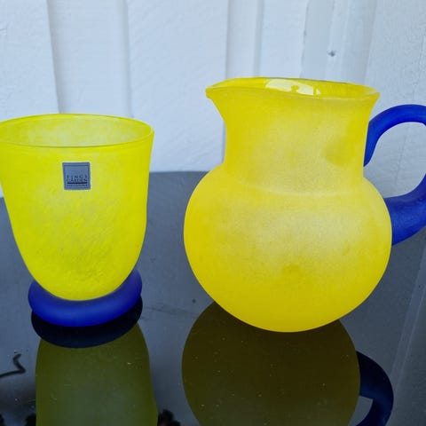 Nääsgränsgården liten mugge i hvitt porselen med blå prikker. Størrelsen er egnet til servering av fløte, melk eller saus ved borddekking. Design og produsentinformasjon er merket under kannen. Design: Laila Bülow-Mattsson. Kan sendes, hentes på Disen eller på dagtid i Nydalen.