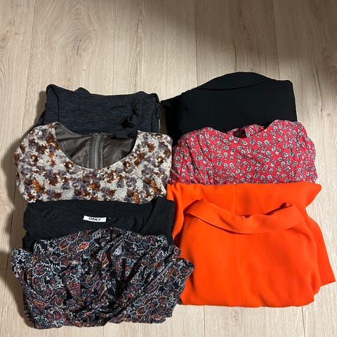 Kjole, jumpsuite (mangler belte), 2 jeans, linbukse, skjorte, bluse og en «skinnjakke». Størrelse M/L.