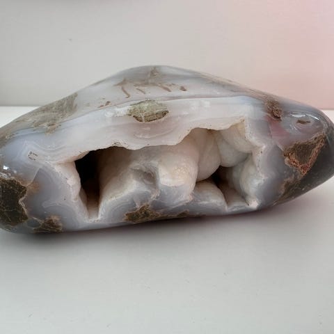 To dekorative steiner i blå kalsedon / agat selges. Naturlig og delvis gjennomsiktig med fine mønstre. Perfekt som pynt eller samlerobjekt.