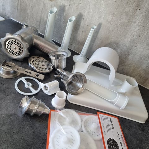 Kenwood kjøttkvern i metall med flere tilbehørsdeler. Settet inkluderer kvernkropp, skrue/snekkedel, flere kniver og hullskiver, påmaterør, trestapper og stor trakt/skål i plast. Delen merket «Jupiter» er kvernkroppen i metall. Egnet som tilbehør til kompatible Kenwood-kjøkkenmaskiner for kverning av kjøtt eller annen mat, forutsatt at kobling og feste passer til aktuell maskinmodell.