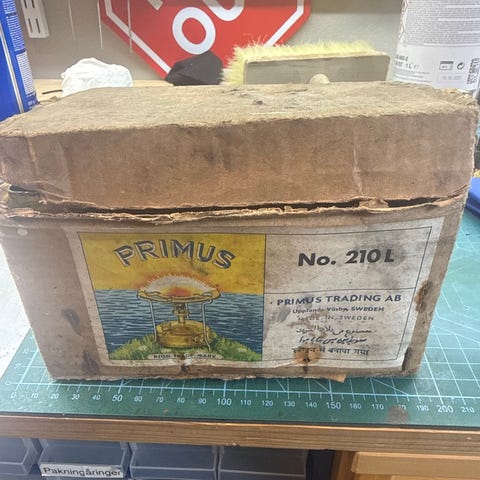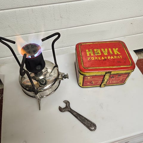 30 mars, Nå fått fyrt den opp og ser ut til å fungere ok. Pumpe trykk og åpne lille kran så det kommer litt parafin (bensin ? )under, så skru igjen. Inn med ei fyrstikk så la det brenne opp, og da skru opp hovedkrana og sette fyr og koke kaffi.... 😅