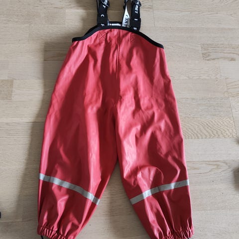 Helt ny Polarn O. Pyret regnbukse for barn i størrelse 74. Regnbuksen er rød. Modellen er unisex og passer både gutter og jenter. Buksen har strikk nederst ved bena og refleksdetaljer for bedre synlighet.