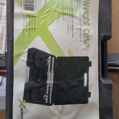 Sett i koffert som inneholder to hantelstenger med skrulås og tilhørende vektskiver. Vektskivene er merket 5 kg og kan kombineres etter behov for å tilpasse belastningen. Skrulåsene sørger for at skivene sitter fast på stengene under bruk.