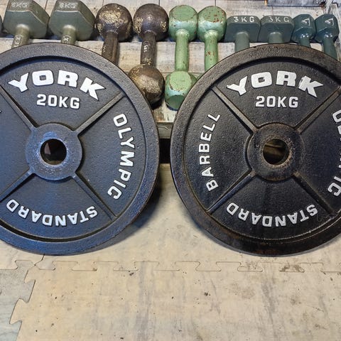 2 stk. Vektskiver à 5 kg: Støpejern (Diameter ca. 19 cm).