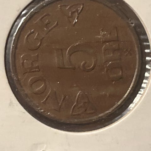 120 stykk:Samling norske 5-øremynter i kobberfarge . Myntene oppbevares samlet i en plastpose. Egner seg for myntsamling, sortering eller som rekvisita. Antall, årstall og nøyaktige valører er ikke spesifisert av selger.