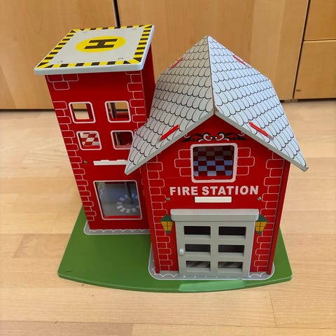 Fin brannstasjon i tre, med diverse utstyr.