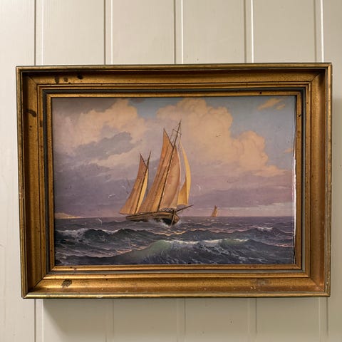 Maleri med kystmotiv som viser en seilbåt og bebyggelse ved sjøen i solnedgang. Fargene går hovedsakelig i varme toner som gult, oransje og brunt, med innslag av mørkere konturer i båt og landskap. Bildet er innrammet i en dekorativ, profilert ramme i gullfarge med utskårne detaljer i hjørner og midtpartier. Motiv og ramme egner seg som veggdekor i stue, gang eller andre oppholdsrom der man ønsker et klassisk kystmotiv. Størrelse 66x56 cm