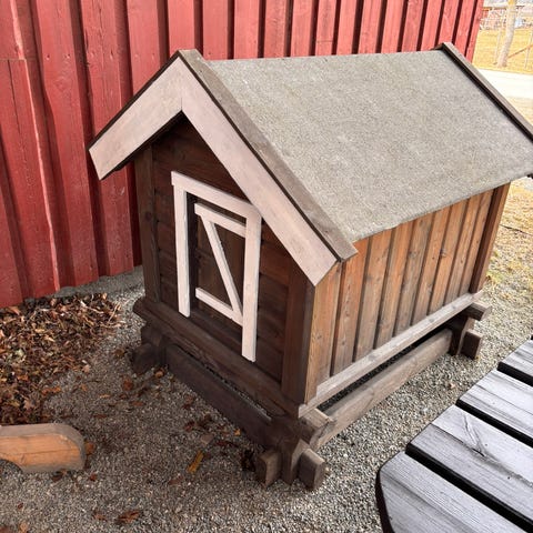 Duehus i tre med saltak og enkel dør i front. Huset har flere faste hyller på innsiden langs den ene siden, egnet for 12-15 duer. Ytterveggene er delvis malt, mens dør og innside er ubehandlet treverk. Taket er tekket med takshingel.