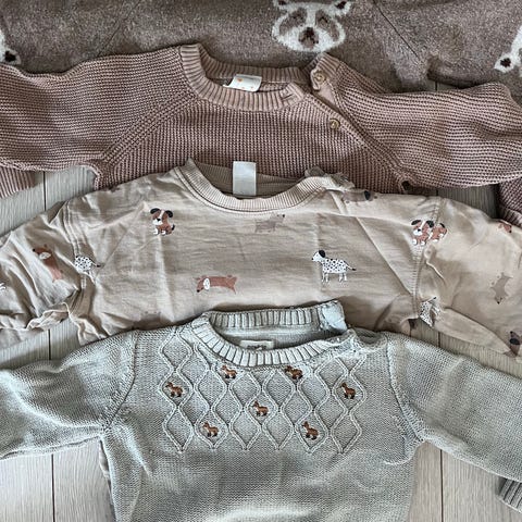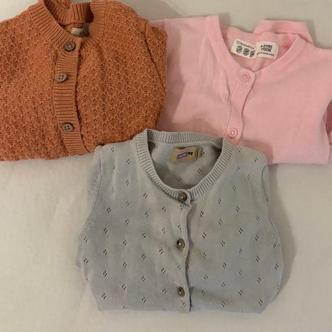 To cardigan/jakker fra Newbie. Den brune er str 86, litt blass i fargen. Den hvite er str 86/92. Fra røyke og dyrefritt hjem.