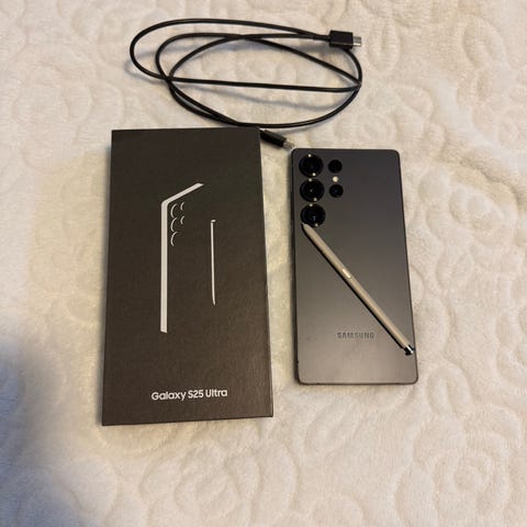 Samsung Galaxy S25 Ultra mobiltelefon med 256 GB lagringsplass. Modellen har stor skjerm, flere kameraer på baksiden og Pen.