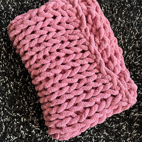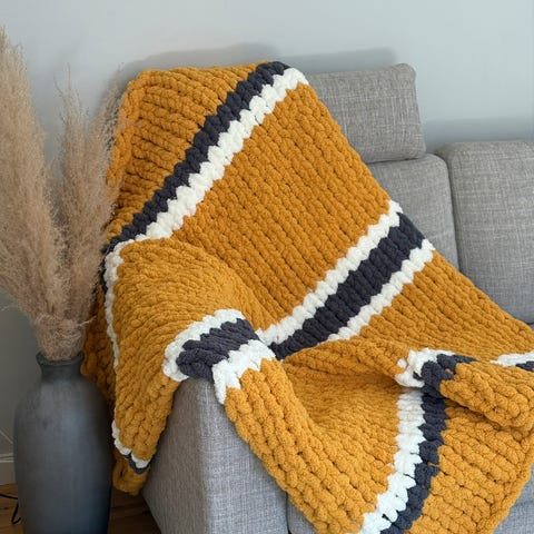 Kjempestort chunky strikket pledd i gul farge. Pleddet har ekstra tykke masker og grovstrikket struktur som gir et markert uttrykk. Egner seg som teppe i sofa, på seng eller som dekorativt innslag i stue eller på balkong.