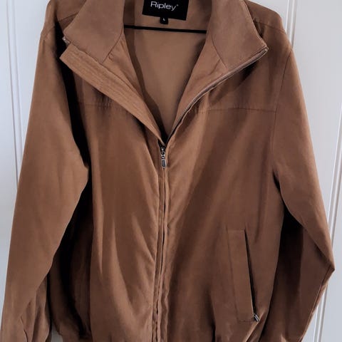 Fin grønn jakke i semsket stoff med ullermettsider og albuelapper. Brukt, noen flekker som vises på bildene — god til å se fin ut til en verdag.