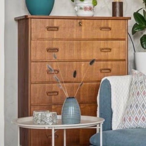 Kommoden har noen skjønnhetsfeil i lakken som kan fikses med fint stålull og møbelolje. Det er også to små hakk på fronten. Se bilder.