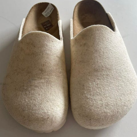 Birkenstock tøfler i størrelse 40 normal (ikke smal). Overdel i grå ullfilt og formstøpt fotseng. Yttersåle i gummi med mønster for grep. Egnet som innetøfler til daglig bruk.