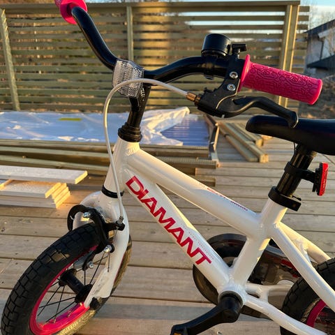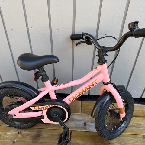 Diamant barnesykkel med 12" hjul i rosa farge. Sykkelen har lav ramme som gjør det enklere for barnet å komme seg av og på. Utstyrt med justerbart sete og styre for tilpasning til barnets høyde. Egnet som første sykkel for små barn som skal øve balanse og sykling på korte turer og i nærområdet. Nesten ikke brukt. Sendes ikke