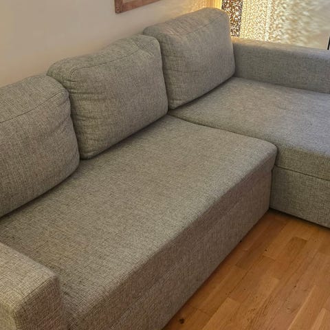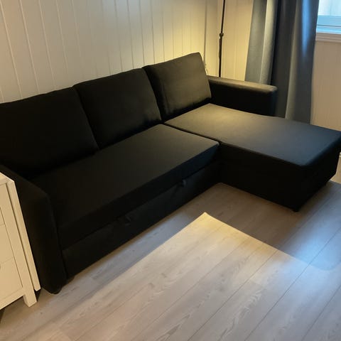 Fin og behagelig sovesofa i mørk grå tekstil som kan speilvendes. God lagringsplass til overmadrass og ekstra dyner og puter. Overmadrass følger med.
