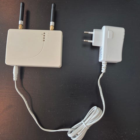 Telldus TellStick ZNet Lite V2 smarthus-gateway med Z-Wave Plus-støtte. Enheten kobles til nettverk via kabel og brukes som sentral for styring og overvåking av kompatible smarthuskomponenter. På bildene følger det med strømforsyning og antenne.