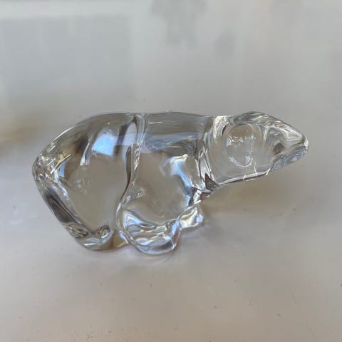 Glassfigurer formet som pingviner i klart og farget glass. Sett med tre figurer i ulike størrelser, hvor to er ca. 10 cm høye og én er ca. 8 cm høy. Figurene har svart og hvit kropp med gul detalj ved hodet.
