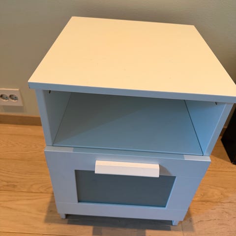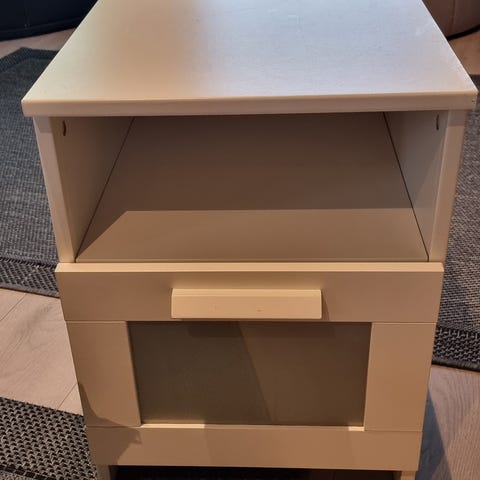 Malm nattbord fra Ikea med en skuff og en hylle selges. Et bruksmerke på oversiden av venstre skuff og noen små på toppen (de på toppen var så små at de ikke viste da vi tok bilde), ellers pent brukt.