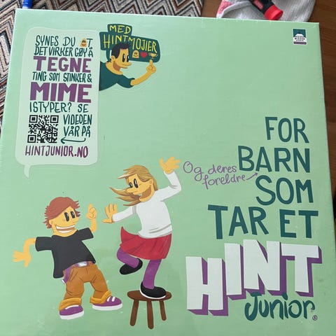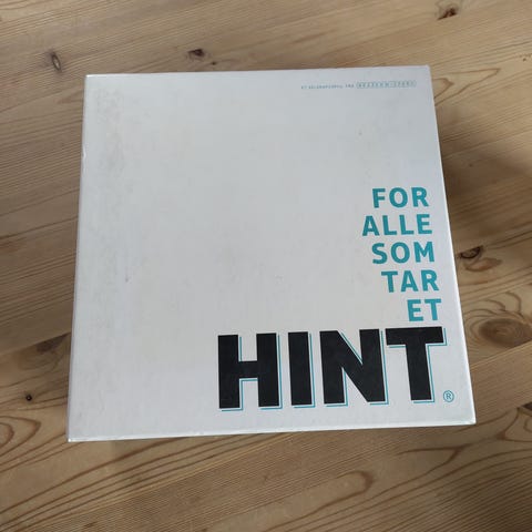 Hint brettspill. Spillet er et selskaps- og quizlignende brettspill der deltakerne skal gi og tolke hint innen ulike kategorier. Passer til flere spillere og kan brukes som underholdning i sosiale sammenhenger, for eksempel familiespillkveld eller vennekvelder.