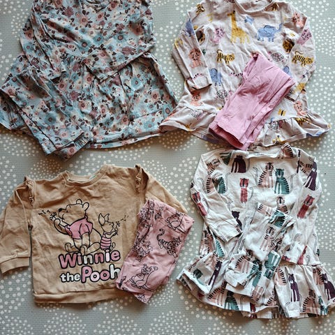 Pakke med tynne gensere. Name it Peppa Gris, Lindex med blomster og H&M rød med volanger.
