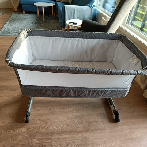 Babyseng som kan "monteres" ved siden av seng eller pakkes sammen og brukes som reiseseng. Fremstår som ny, bortsett fra litt misfarging i hodeenden som ikke gikk bort i vask.