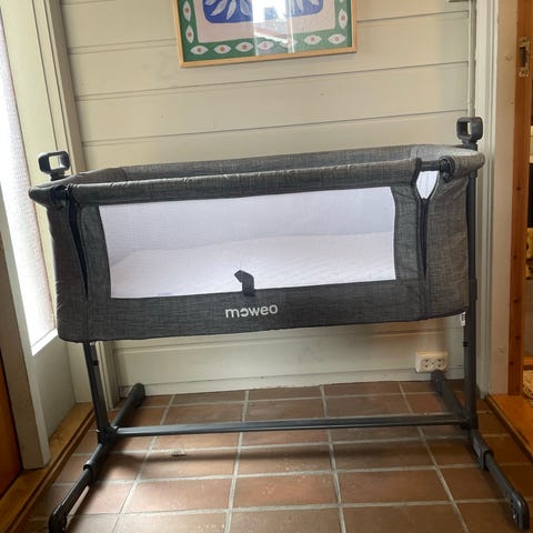 Moweo bedside crib babyseng i grå tekstil med sort understell. Sengen har nettingpaneler på sidene som gir innsyn og lufting. Den kan plasseres inntil voksenseng som bedside crib, eller brukes frittstående. Leveres med madrass og transportbag som gjør den enkel å ta med og oppbevare.
