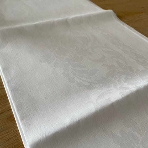 Pen duk i slitesterkt bomull. Et par steder noen veldig lyse gule flekker. Sees nesten ikke, se bilde