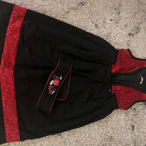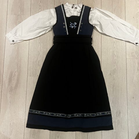 Name it bunad for jente i størrelse 128. Kjolen er i blå og svart bomull med broderte blomsterdetaljer på overdelen og skjørtet. Den har hvit skjorte med mønster på krage og mansjetter, samt tilhørende veske som vist på bildene.
