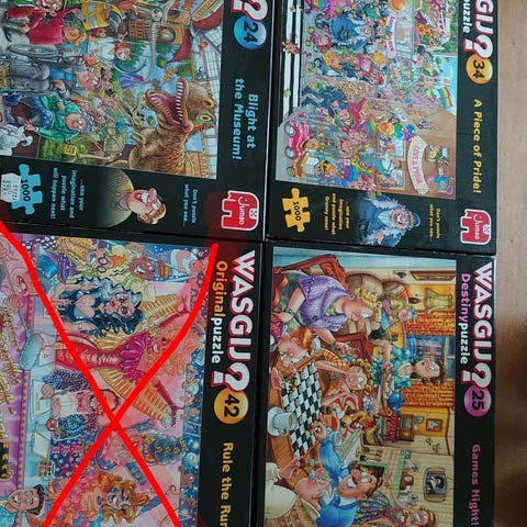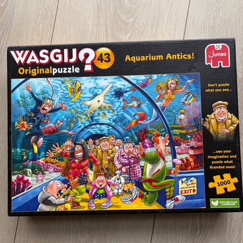 Jumbo Wasgij Original 26 puslespill. Motivene på bildet viser flere ulike puslespill fra samme produsent, blant annet Wasgij Original 26. Puslespillene har fargerike illustrasjoner og leveres i eske. Egnet for puslespillinteresserte i ulike aldre, avhengig av antall brikker og motiv på de enkelte settene.
