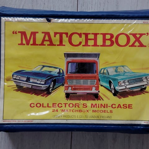 Matchbox Superfast lekebil koffert i blå plast med bærehåndtak. Noen skader. Følger med 40 Matchbox Superfast modellbiler av varierende kvalitet. Kjøper betaler frakt.