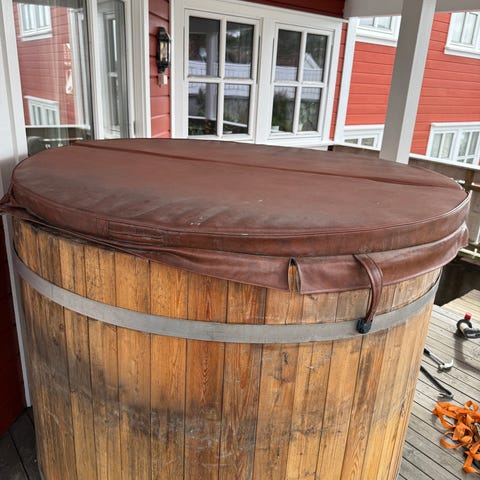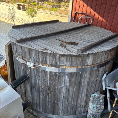 Behov for overflatebehandling. Ikke kjent med noen skader eller råte. Tett ved forrige bruk. For det meste brukt med 4 voksne, da er det god plass.