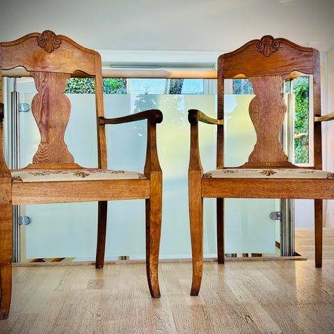 Brukt som spisestoler derfor finnes det noe bruksmerker,spesielt på treverken