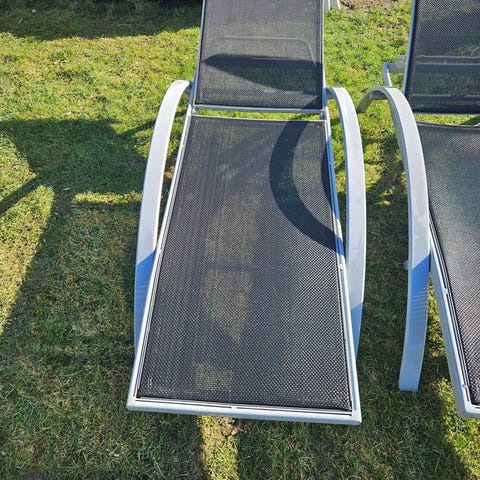 Selger disse veldig komfortable solsengene! De er blitt noe farget av solen, men funker akkurat som de skal. Kan slåes sammen slik at de er enkle å ta med seg på stranden/pakkes bort!